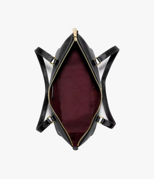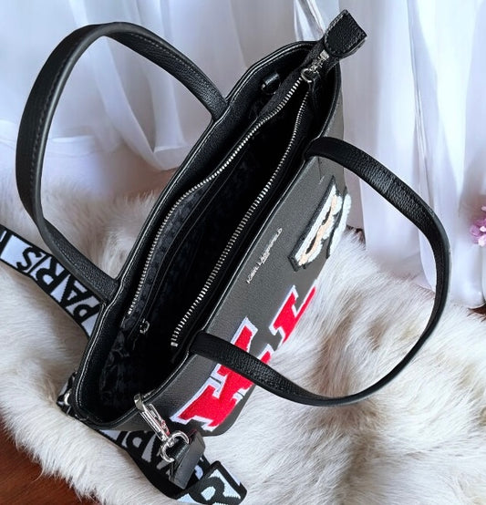 Tote Karl L negra, strap, monedero y parches bordados KL/rojo y Karl y su gatito blancos