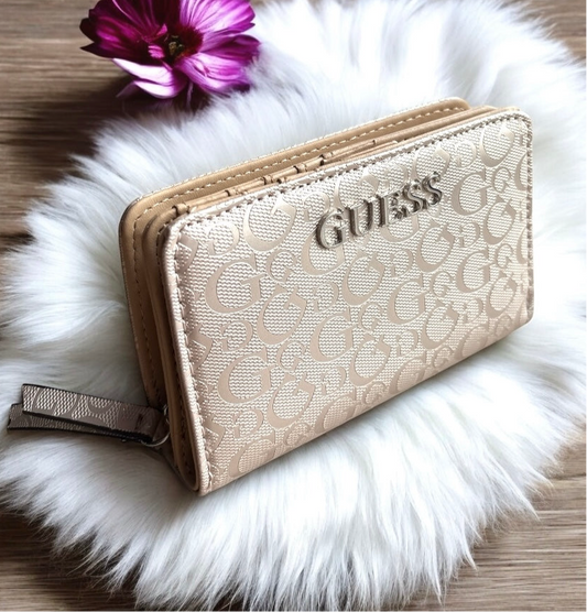 Cartera Guess dorada con monogram placa en letras plateadas