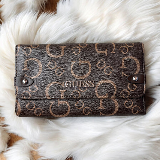 Cartera Guess chocolate con monogram camel y placa