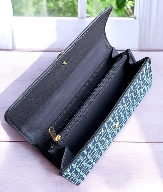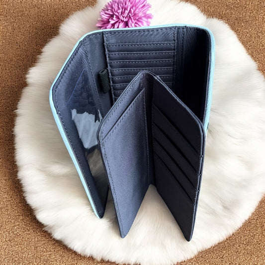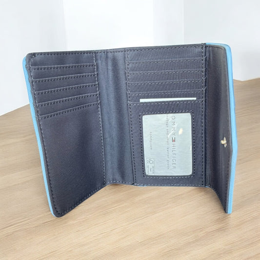 Cartera Tommy H azul claro con textura, cierre atrás y placa plateada