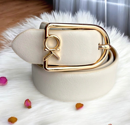 Cinturón beige Calvin k beige placa rectangular y letras doradas