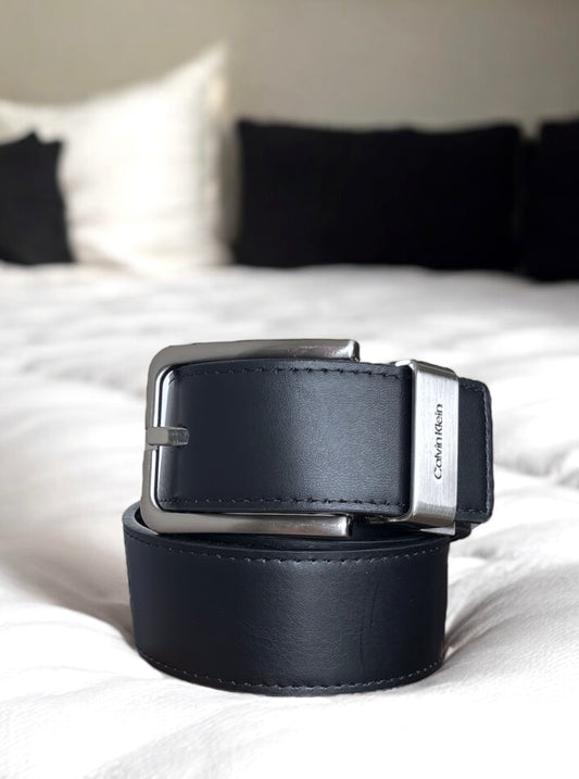 Cinturón Calvin K negro con textura y negro liso,con villa negra reversible para caballero