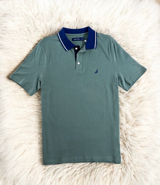 Playera Náutica verde olivo, tipo polo, cuello azul con línea blanca caballeroPrecio habitual $ 763.00 MXNPrecio habitualPrecio unitario / por-