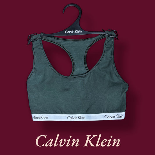 Top Calvin k verde, resorte blanco con letras negras