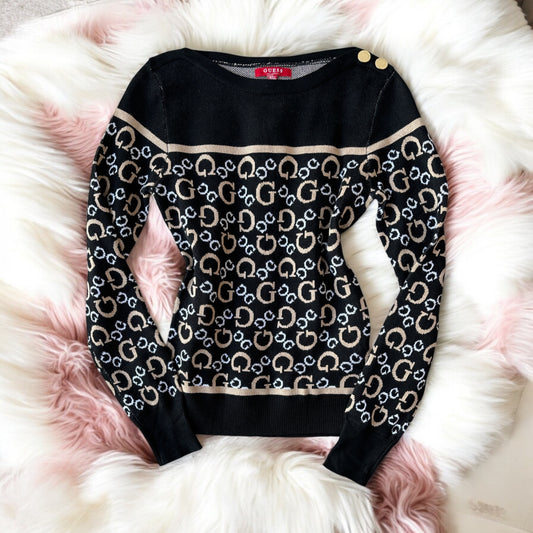 Suéter Guess negro con monogram blanco y botones en el cuello dorados