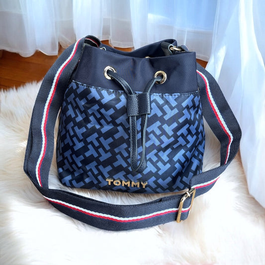 Bucket Tommy H azul marino con monogram strap colores de Tommy y placa dorada