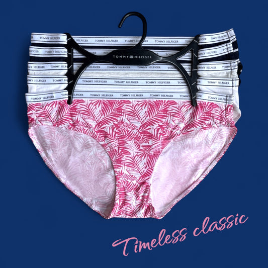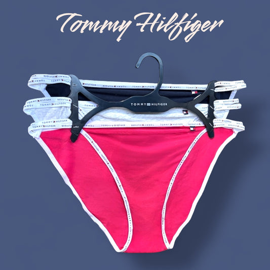 Panties Tommy H rosa, gris, azul marino contorno blanco y detalle de dos resortes delgados en cintura 3pz
