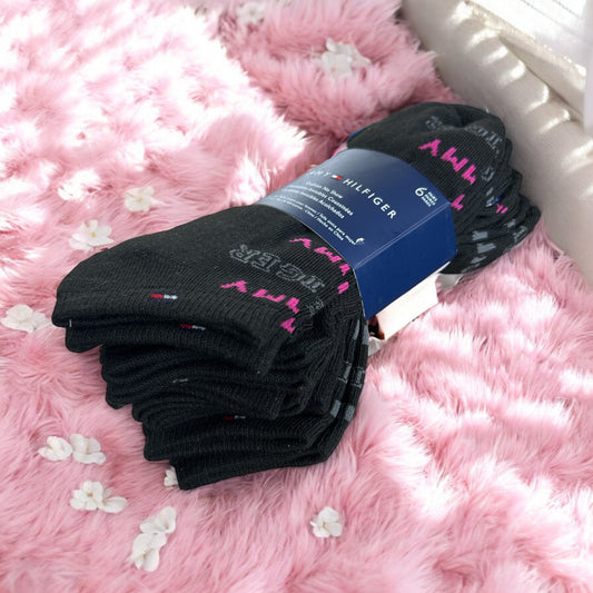 Tines Tommy H negros con letras rosas y gris 6 pares