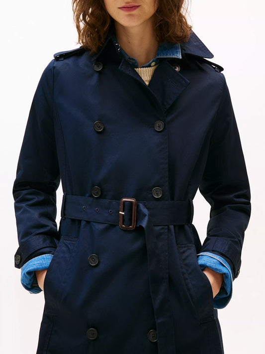 Gabardina Tommy H azul marino, botones café, cinturón y broche en cuello