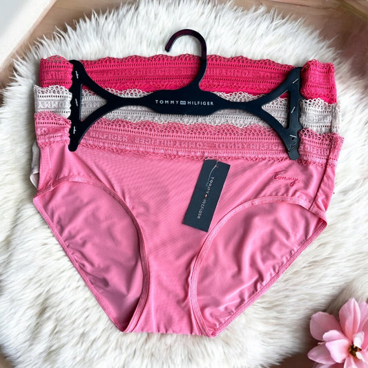 Panties Tommy H rosa, nude y fucsia, letras grabadas, encaje 3pzs