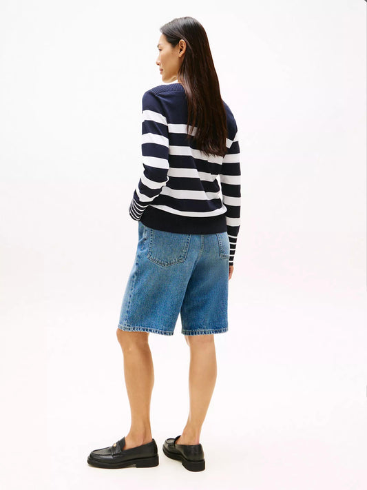 Sombrilla Tommy H azul marino con rayas blancas, mango negro y botones de abrir/cerrar