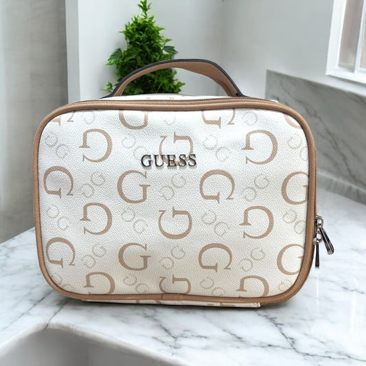 Cosmetiquera Guess crema, monogram camel y placa plateada