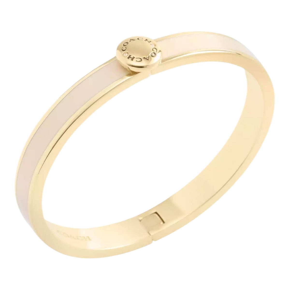 Este brazalete Coach es una combinación perfecta de elegancia y estilo. Con su diseño en color dorado y beige con letras negras, es una opción sofisticada y moderna para cualquier atuendo. Añade un toque de clase a tu look con este brazalete.