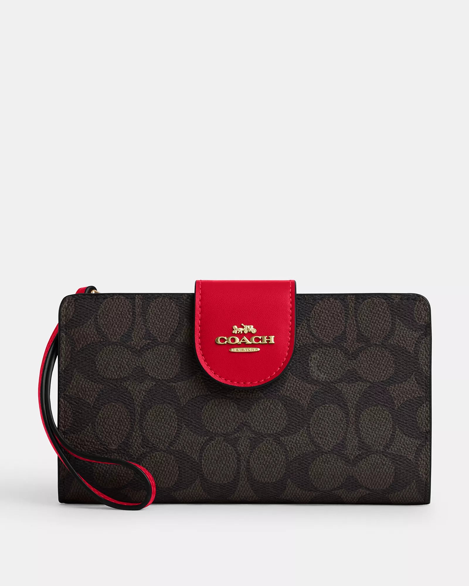 Cartera Coach hecha de cuero de alta calidad en tono chocolate y con detalles en rojo. Esta cartera no solo es hermosa, sino también duradera y elegante. Mantendrá tus pertenencias seguras y organizadas con sus múltiples compartimentos y bolsillos. Perfecta para cualquier ocasión.