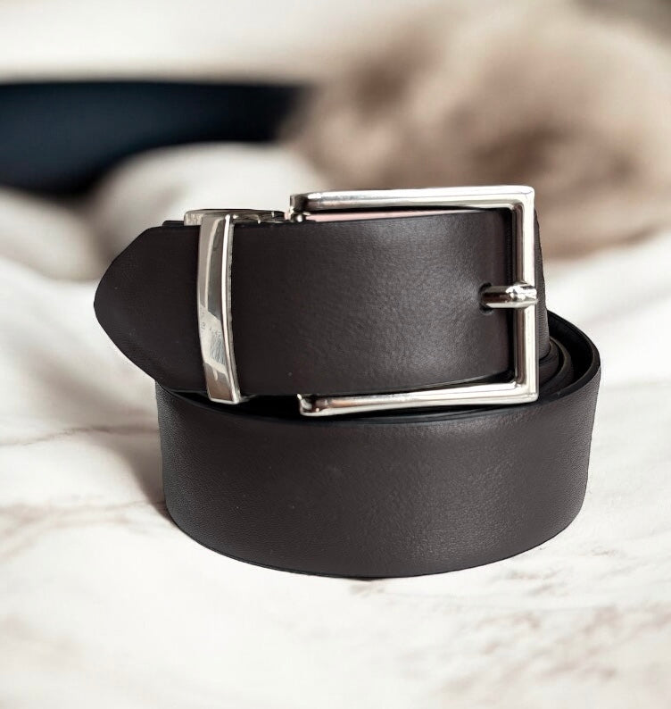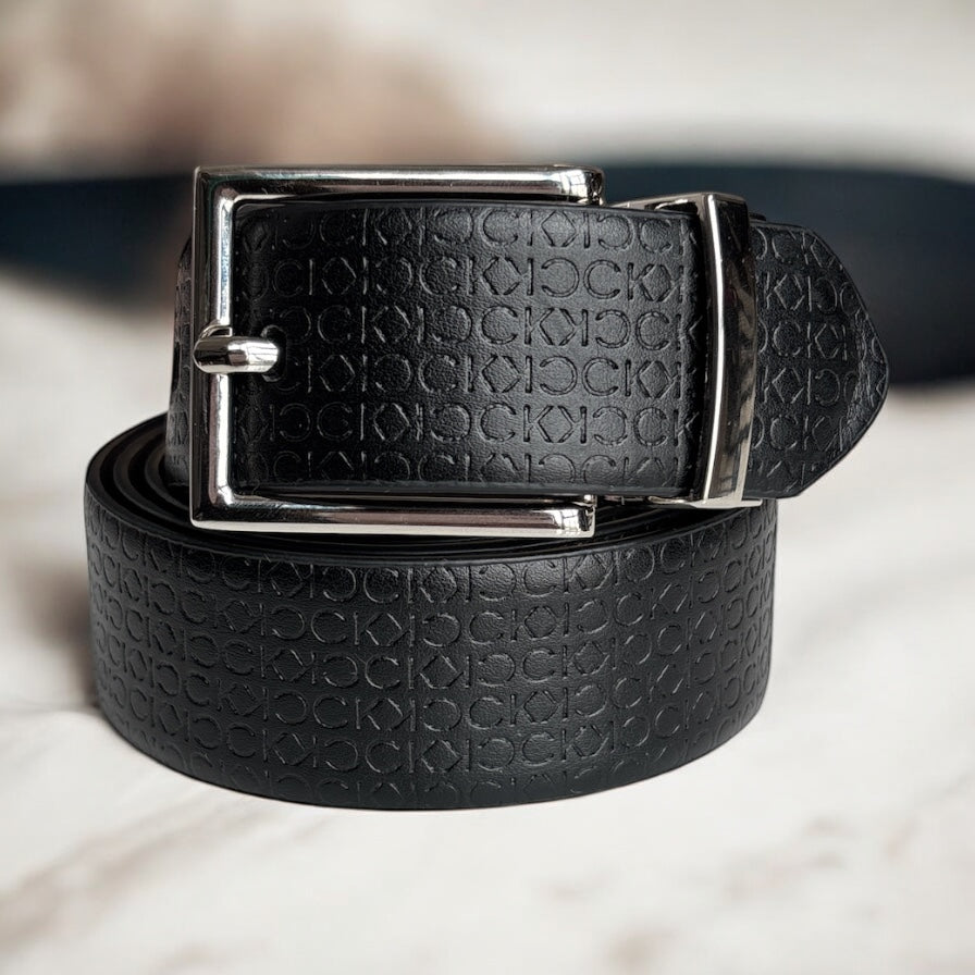 Este cinturón reversible en negro y café de Calvin Klein es una elegante elección para cualquier atuendo. Presenta un monograma grabado y una hebilla plateada para un toque de sofisticación. Con su diseño versátil, podrás lucir bien en cualquier ocasión.
