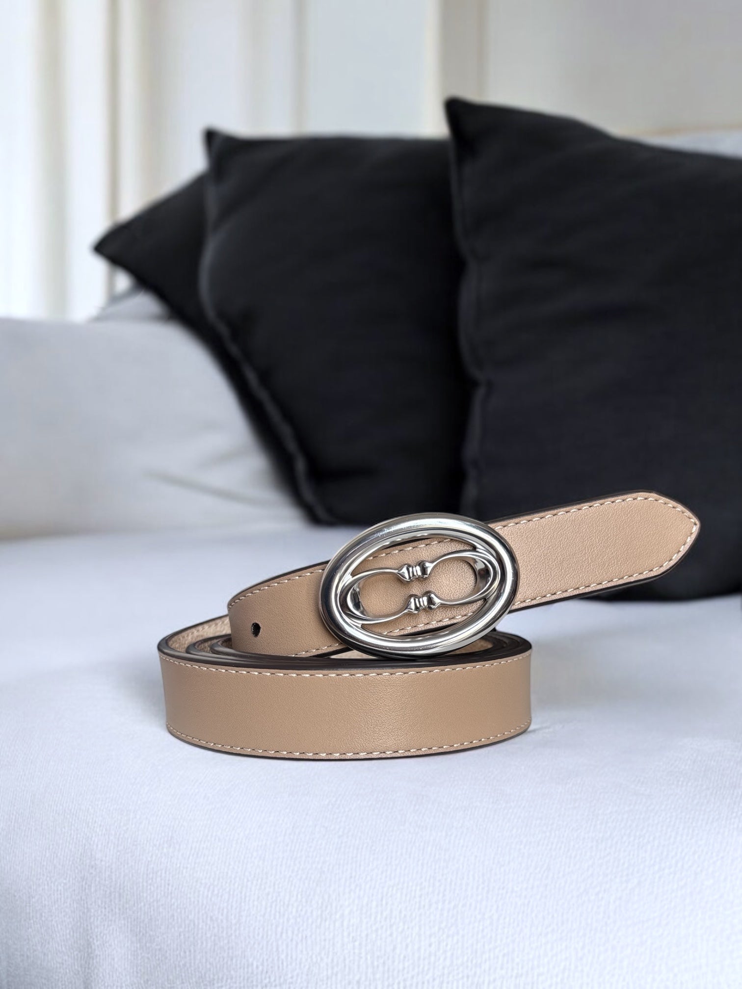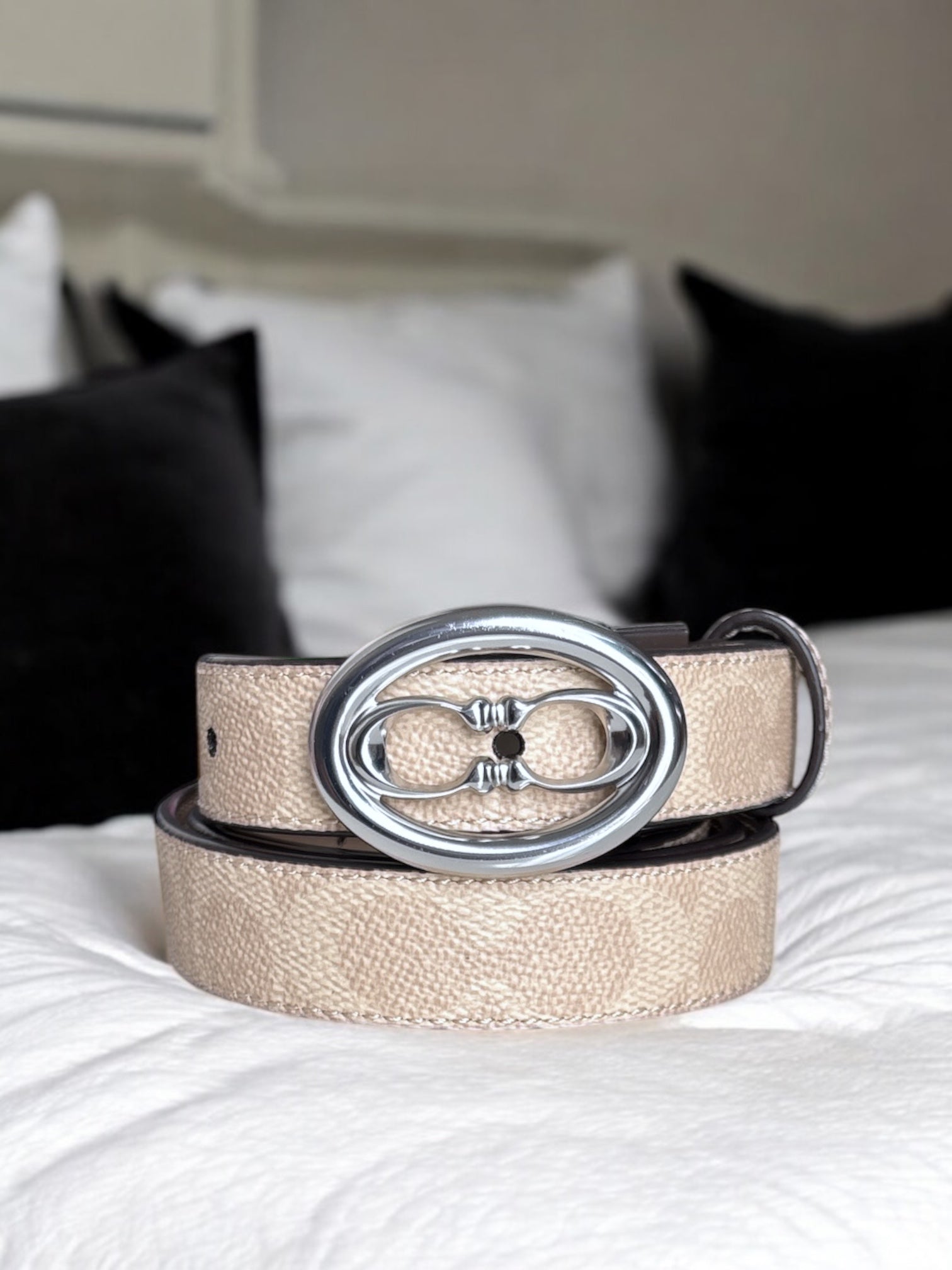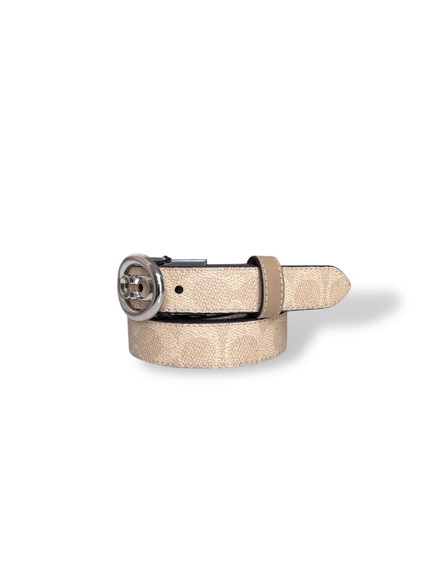 Cinturón Coach beige/cambas y camel liso, placa plateada
