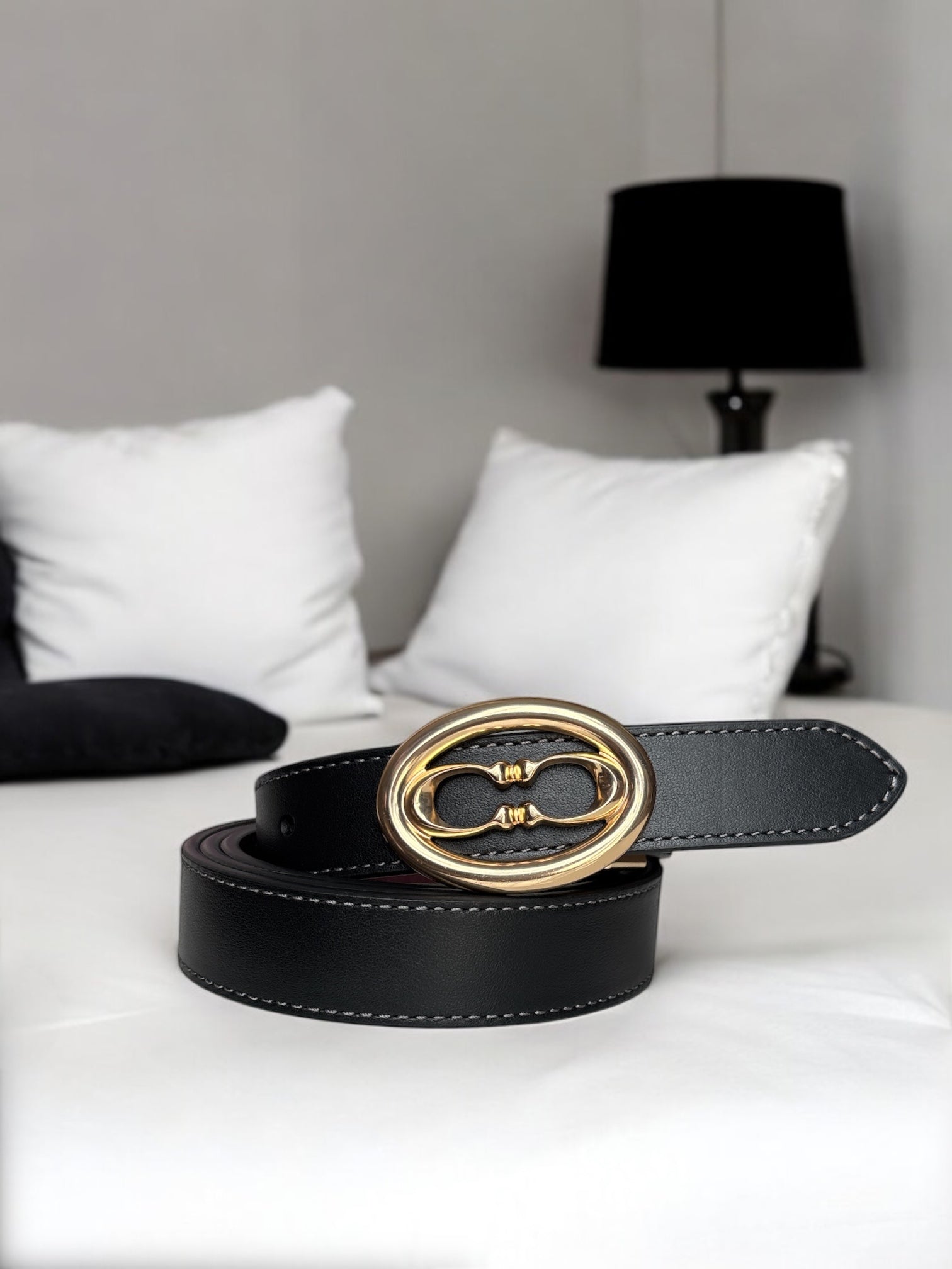 Cinturón Coach negro/vino, placa dorada reversible
