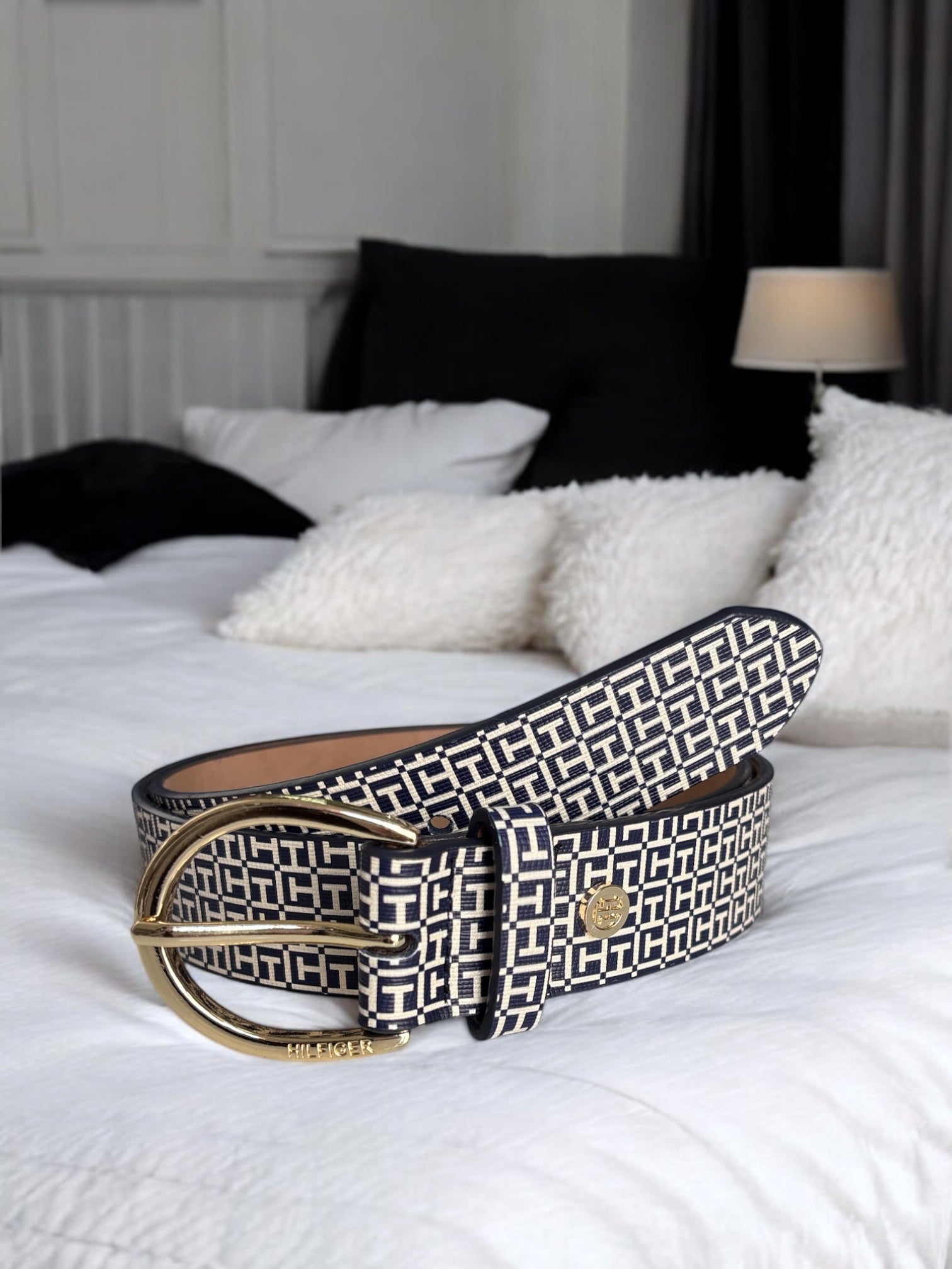 Este cinturón Tommy Hilfiger es un accesorio único que combina el elegante color azul marino con un hermoso monograma crema. La hebilla y placa dorada añaden un toque de sofisticación. Con su diseño distintivo, este cinturón es perfecto para cualquier ocasión.