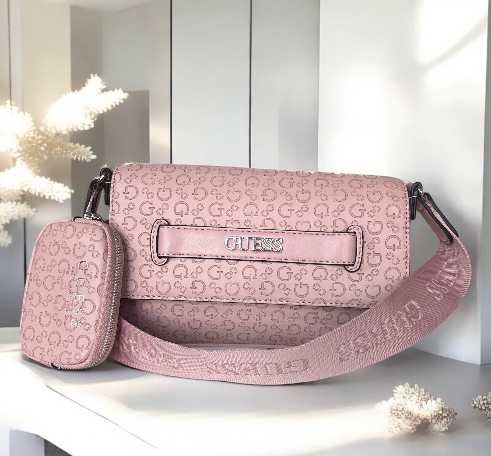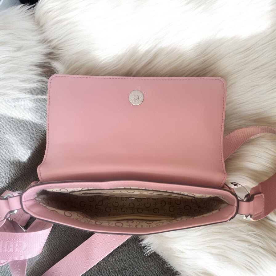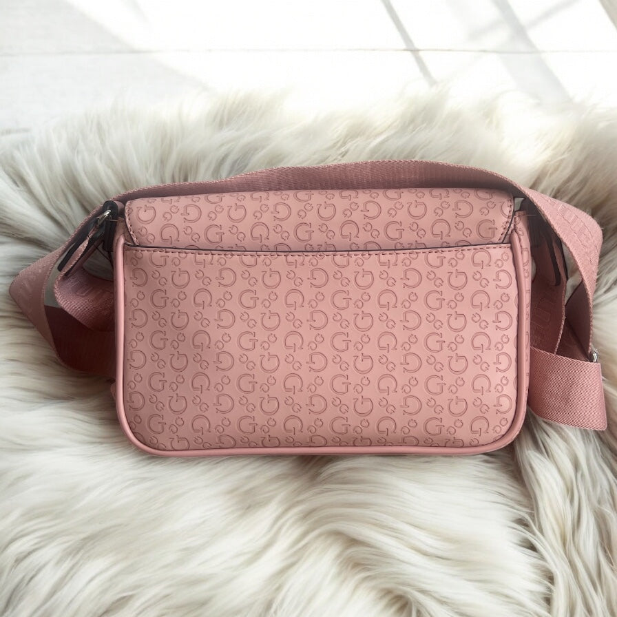Crossbody Guess rosa con monogram, strap grabado y monedero