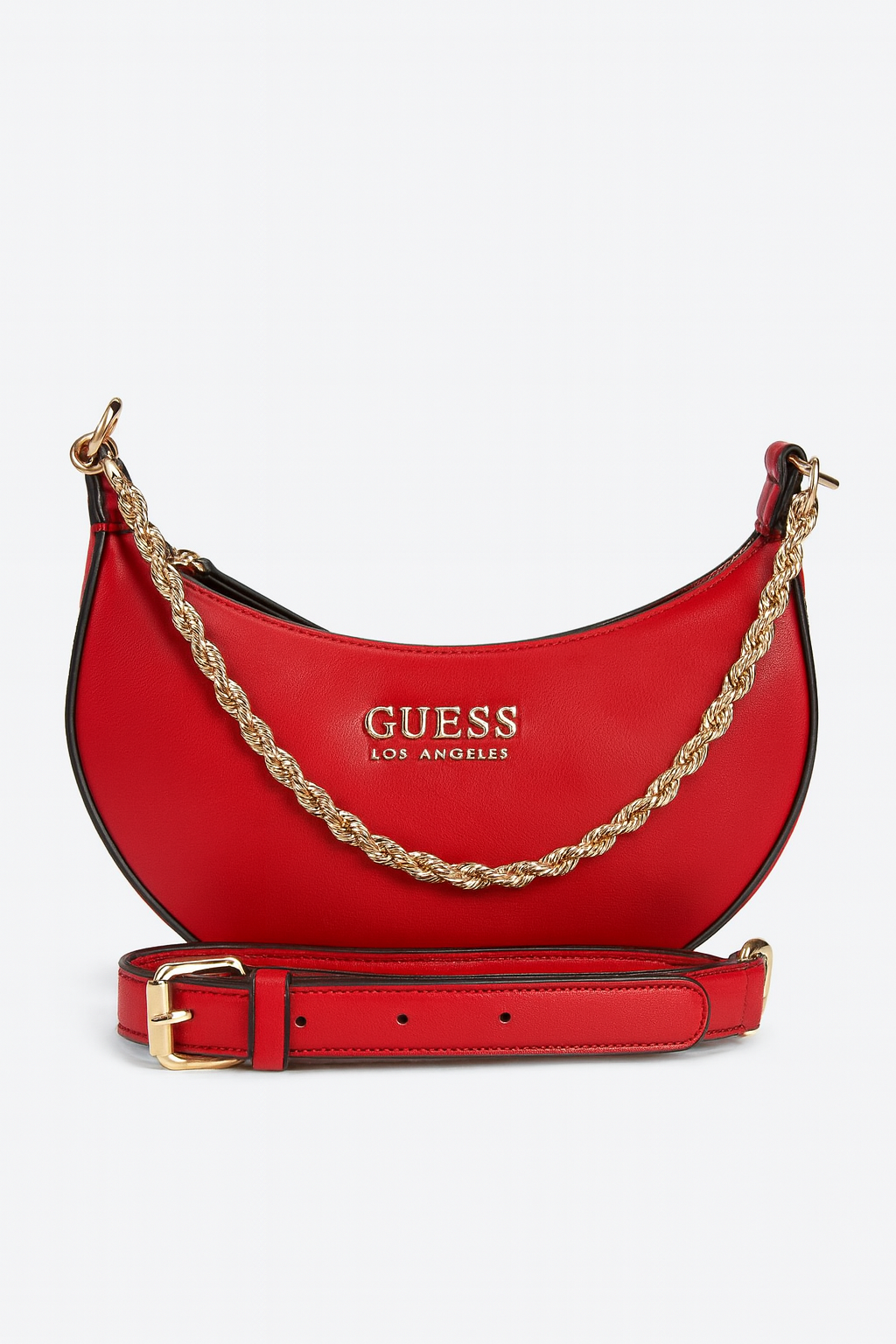 Crossbody/Hobo Guess roja Palmillas, cadena y placa dorada