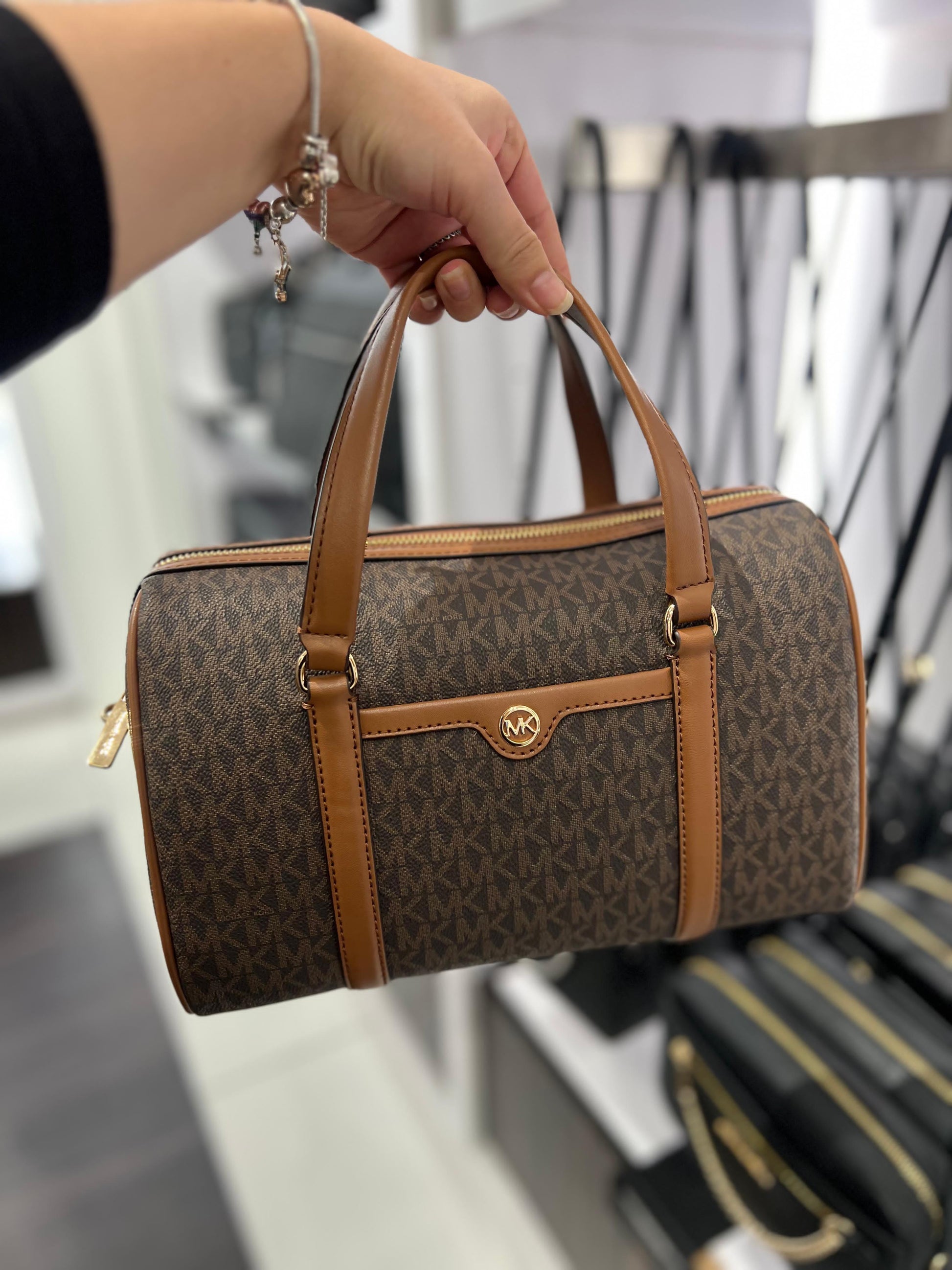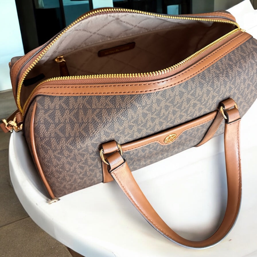 Crossbody Michael k café/chocolate con monogram con strap ajustable y placa dorada