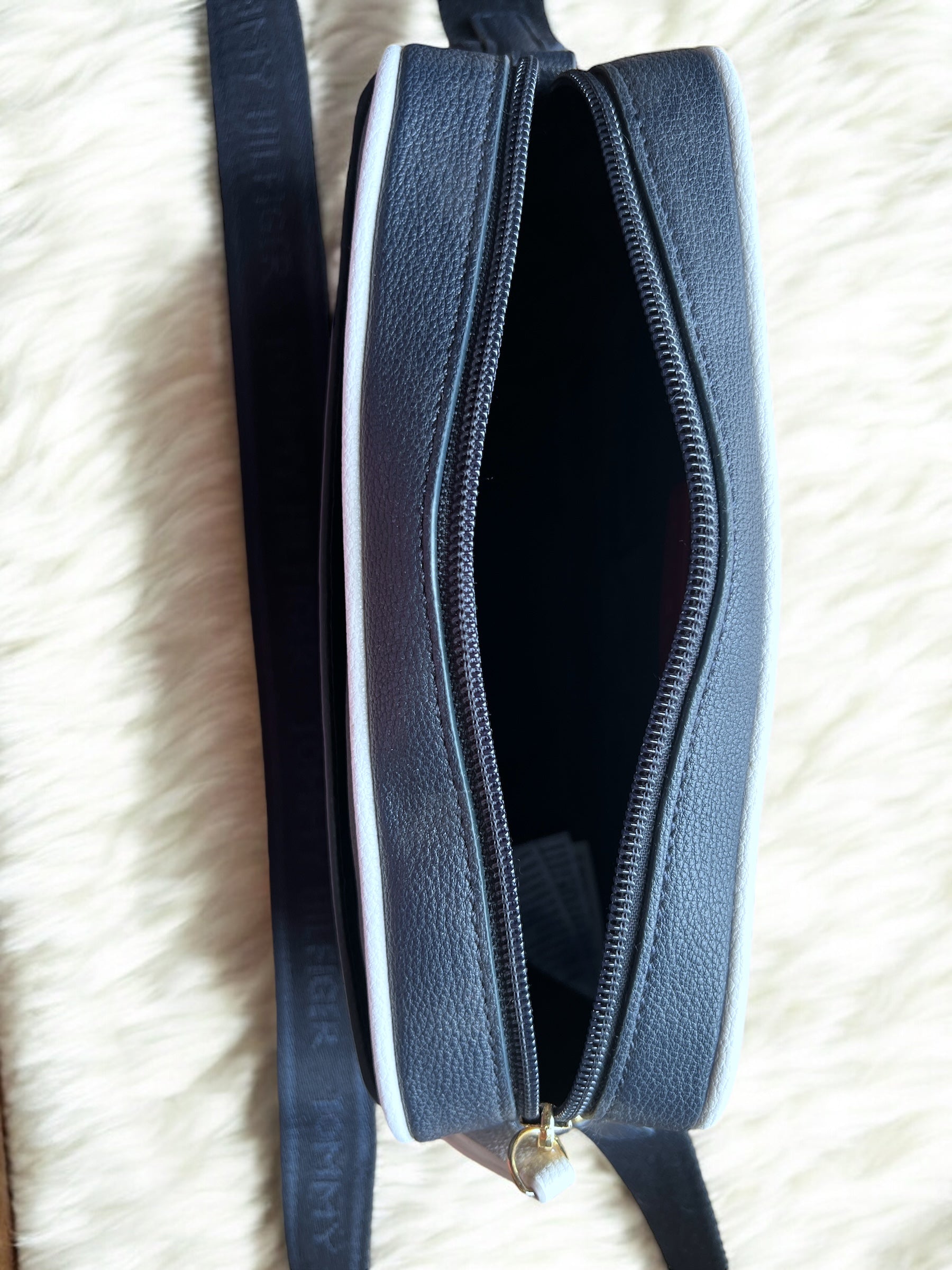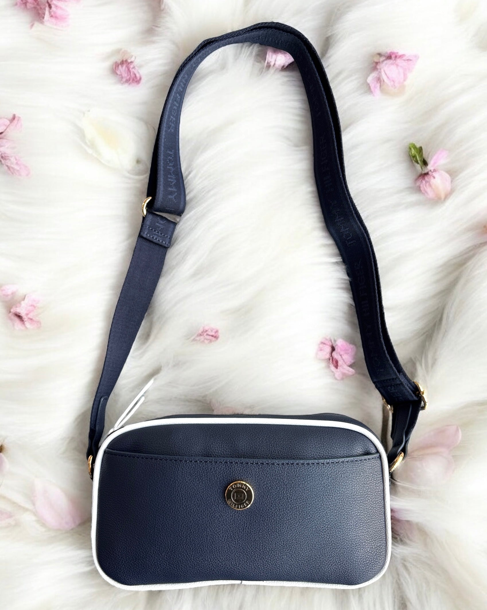 Crossbody Tommy H azul marino con raya blanca y placa dorada redonda