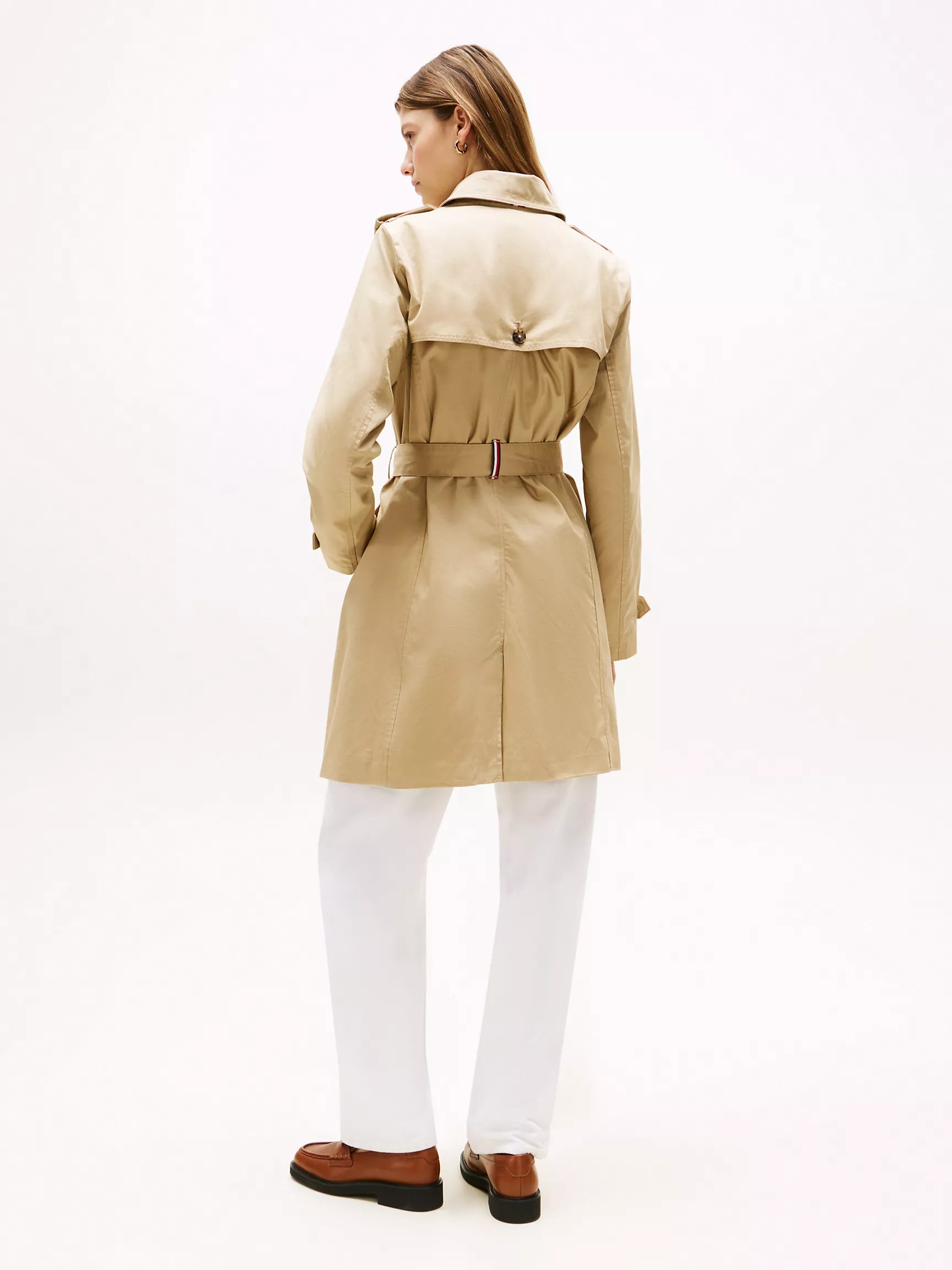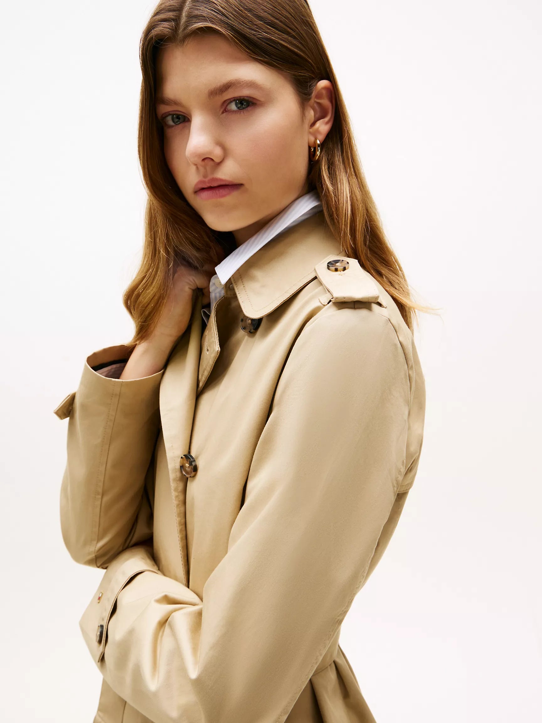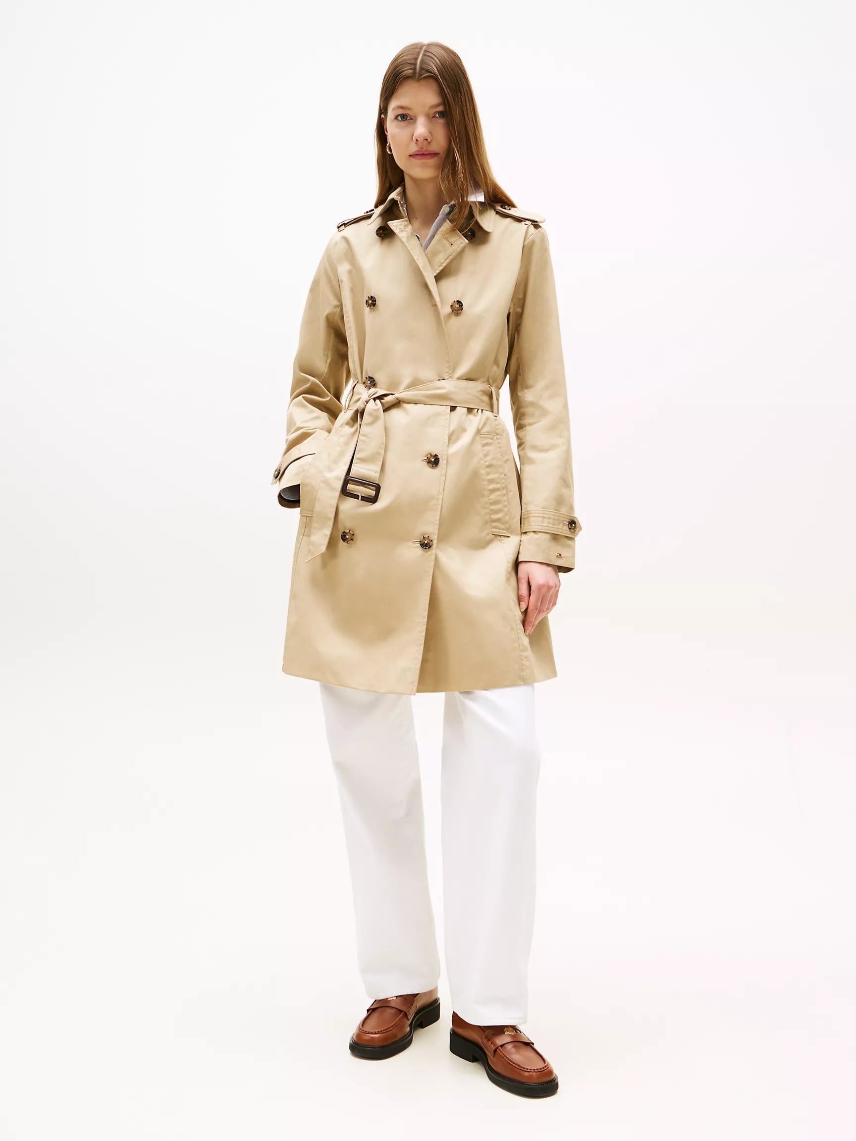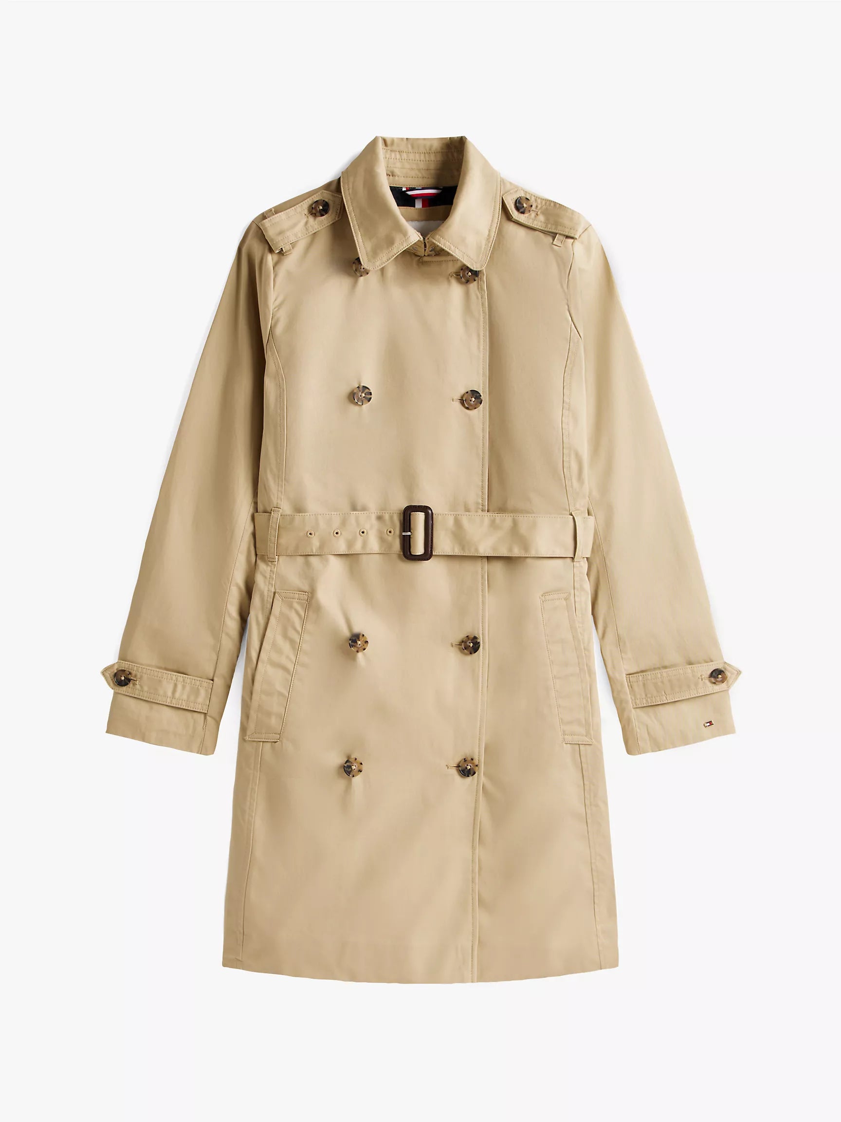 Gabardina Tommy H arena, cinturón ajustable, botones animal print y broche en cuello