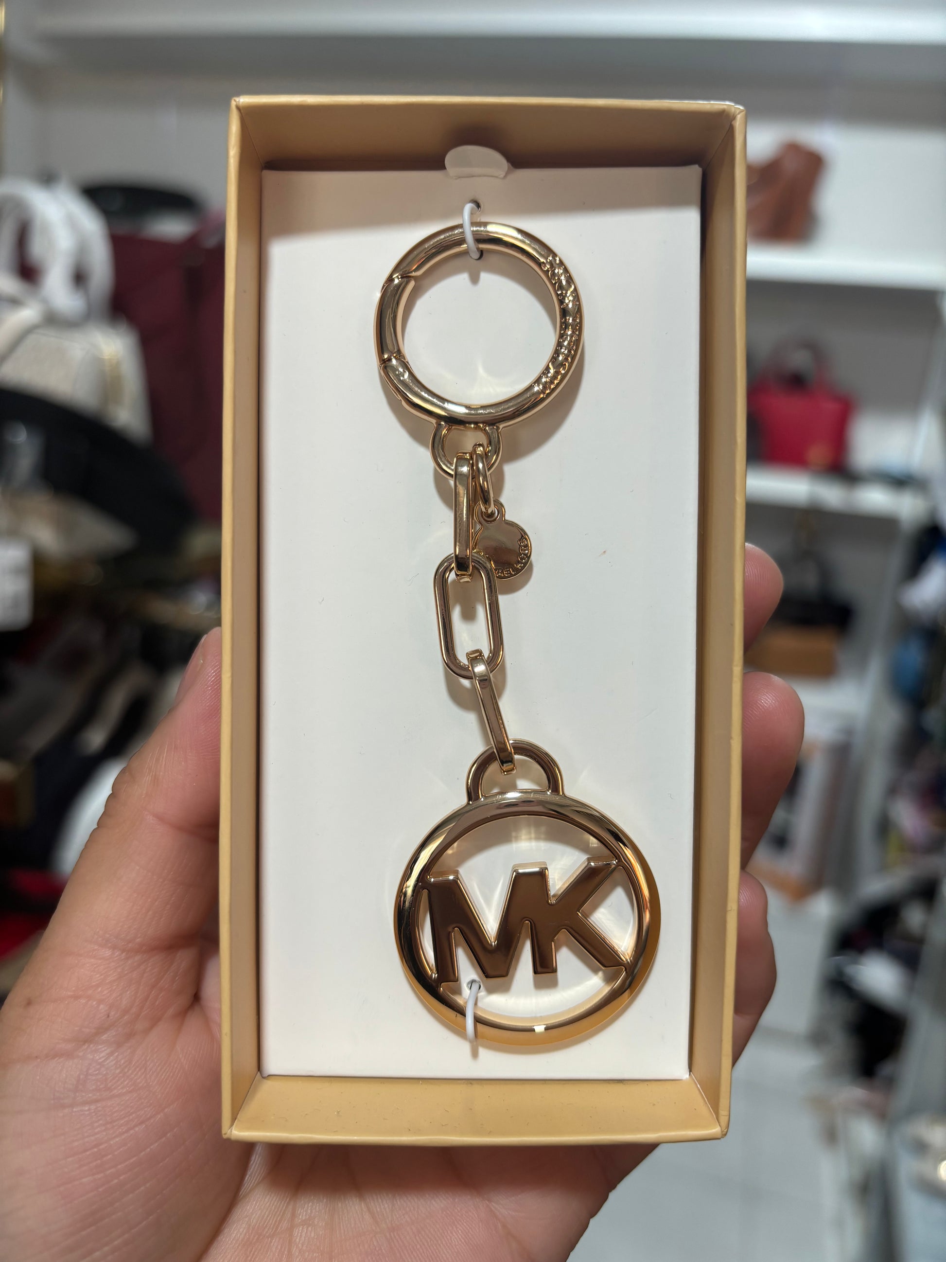El llavero Michael K dorado presenta el logo de la marca, ofreciendo un accesorio elegante y funcional. Su diseño sofisticado no solo resalta la identidad de la marca, sino que también agrega un toque distintivo a su colección de llaves. Ideal para quienes buscan combinar estilo con utilidad.