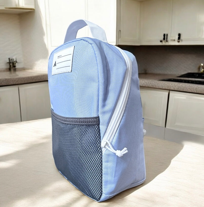 Lunch Bag Adidas azul, letras plateadas, detalles en blanco