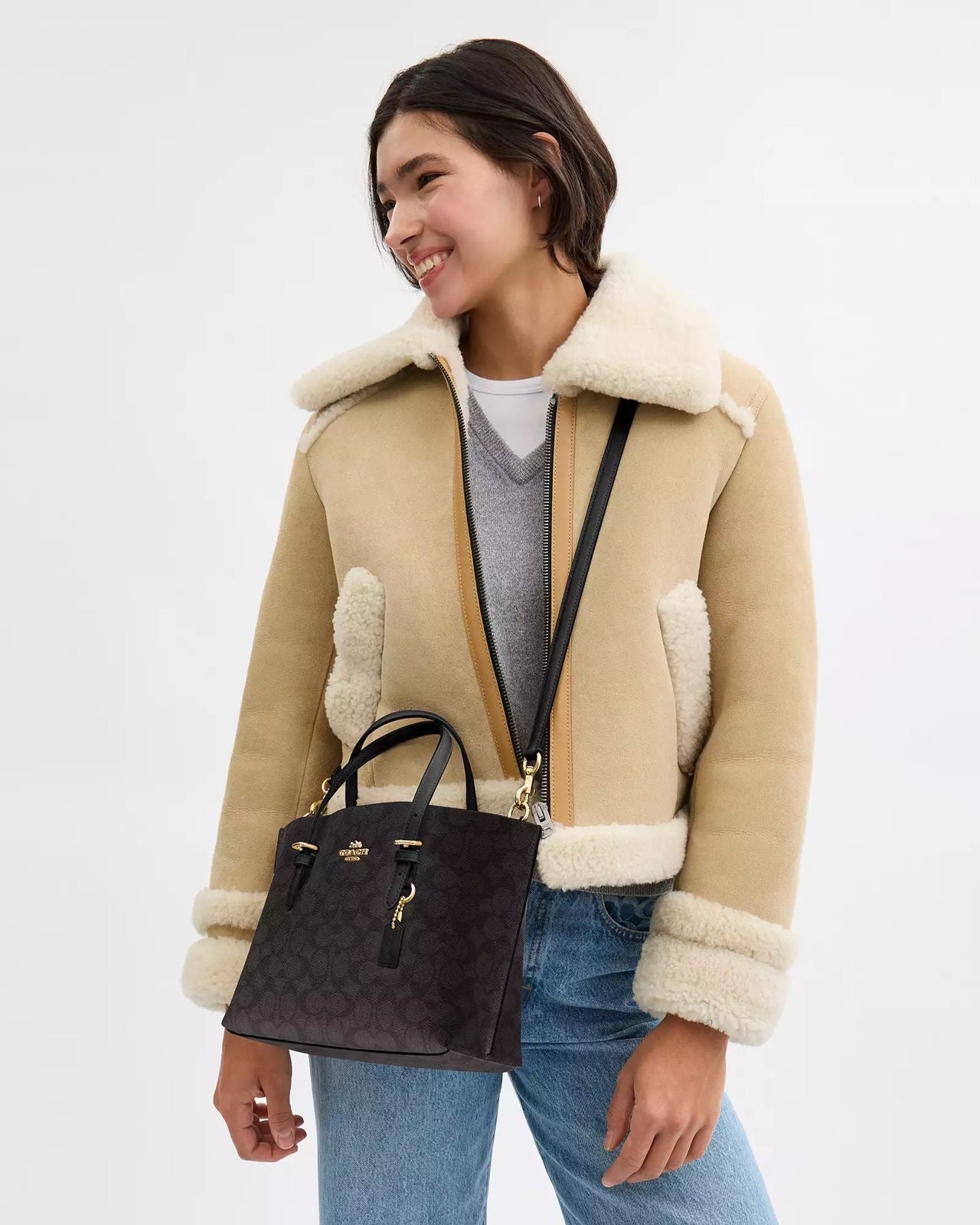 Mini Tote Coach chocolate con canvas en negro, doble strap y placa dorada