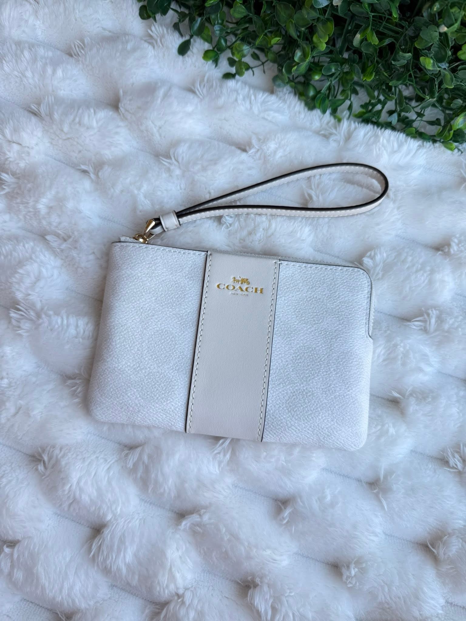 Muñequera Coach blanca/crema con monograma y correa. Hecha de materiales elegantes. Brinda soporte y comodidad a tu muñeca durante tus actividades diarias. Una opción sofisticada para cualquier ocasión.