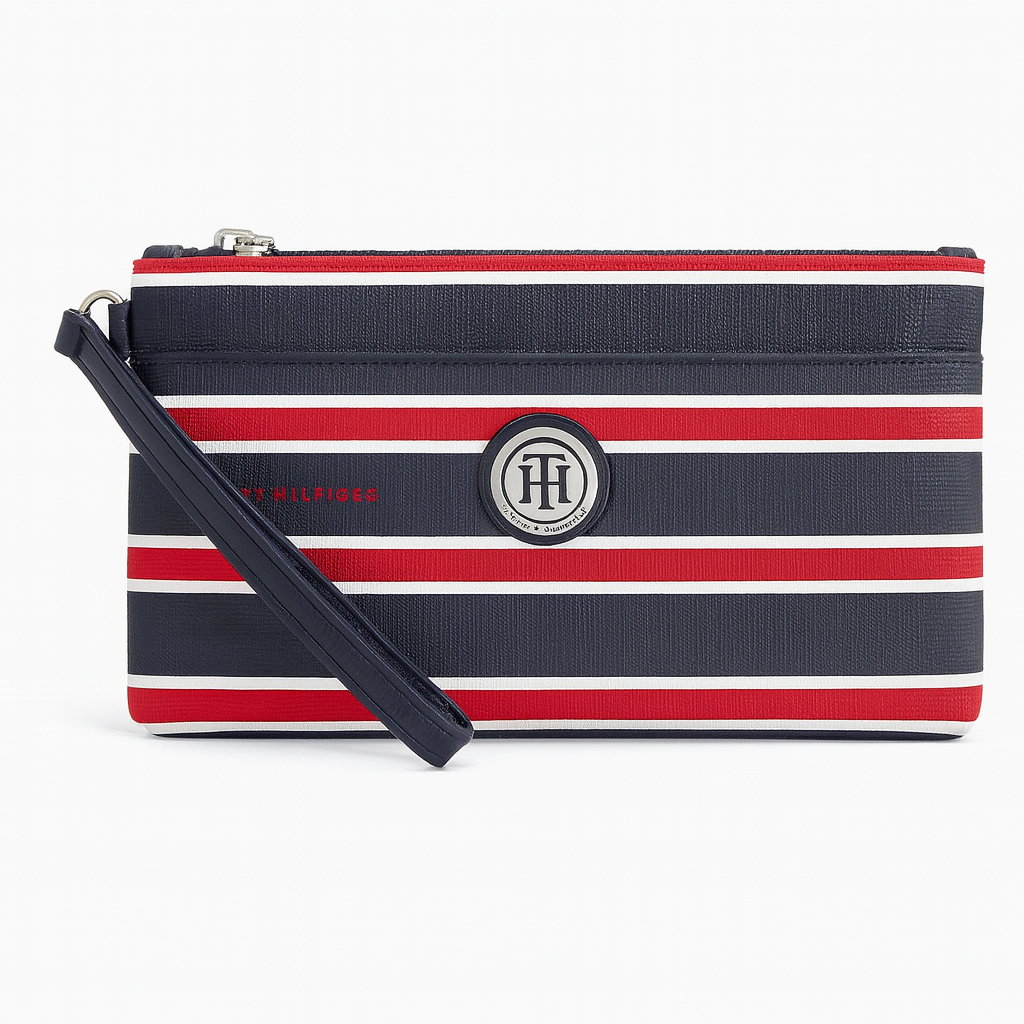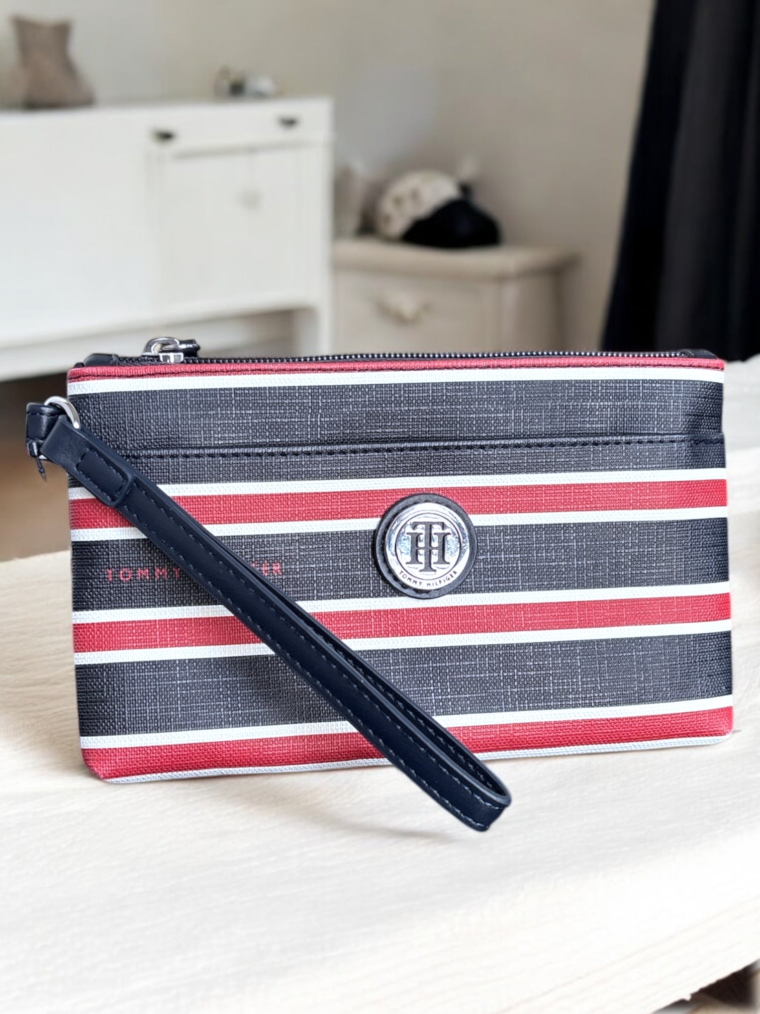 Muñequera Tommy H azul marino, rojo, blanco de líneas y strap placa plateada
