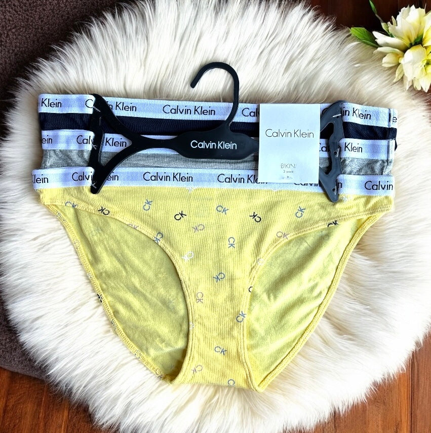 Panties Calvin k amarillo estampado, gris y azul marino con resorte blanco 3pzs