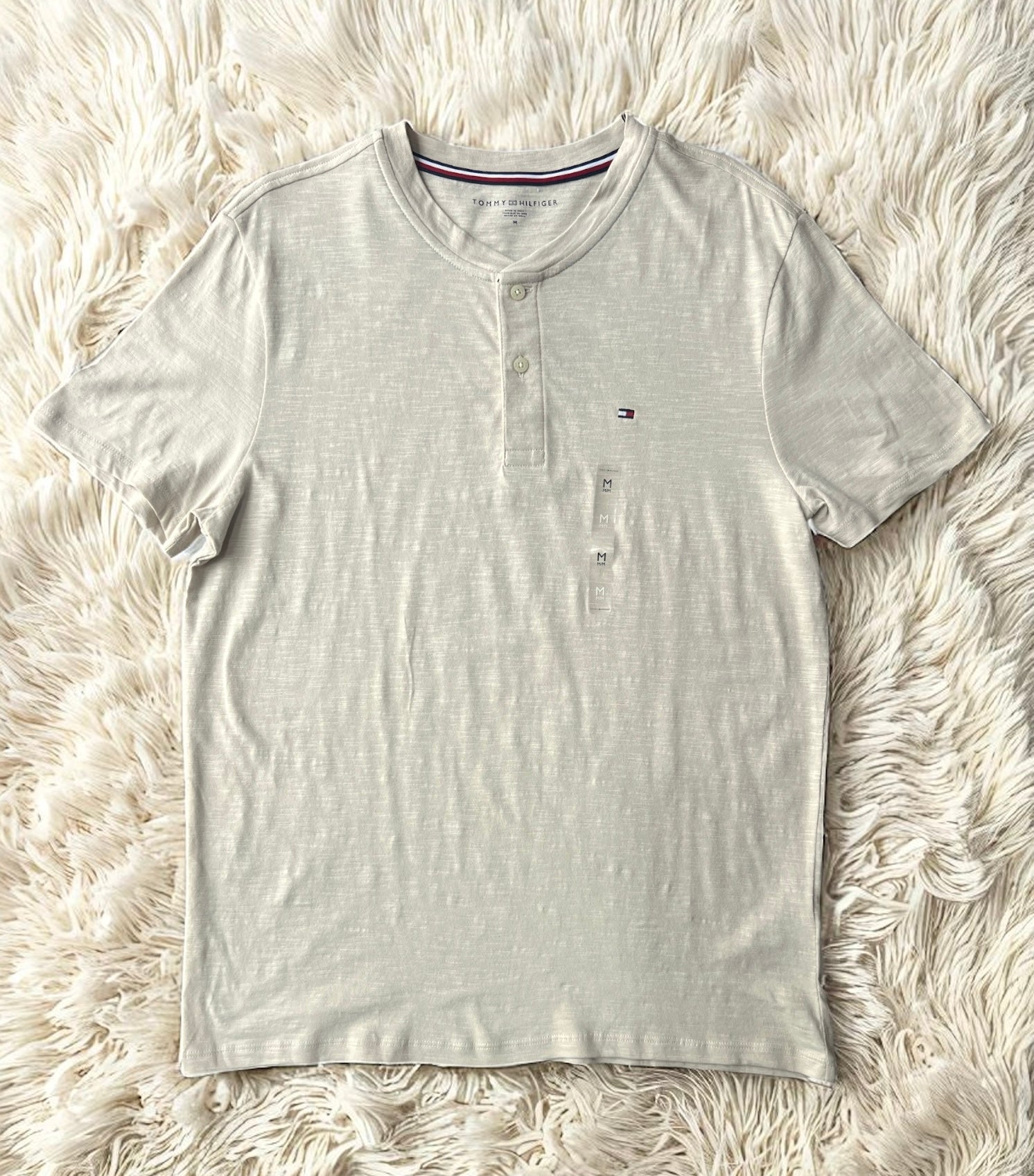 Playera Tommy H beige, cuello con botones y bandera bordada