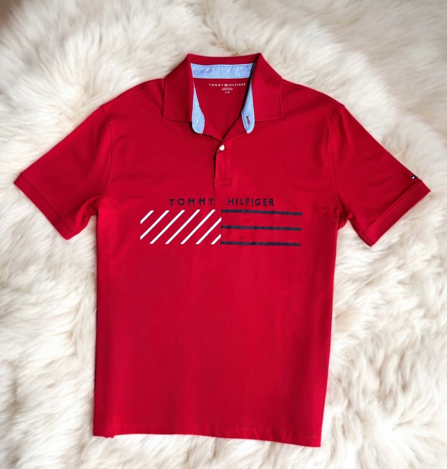 Playera Tommy H roja, letras azul marino, líneas blancas/azul de caballero
