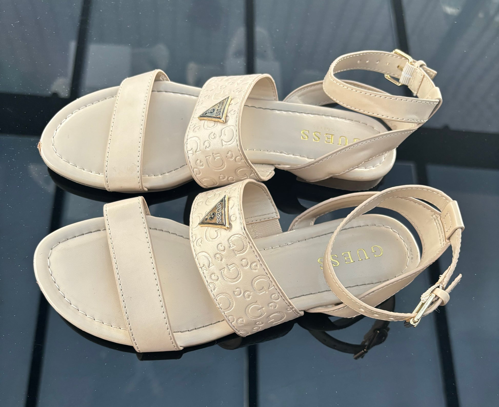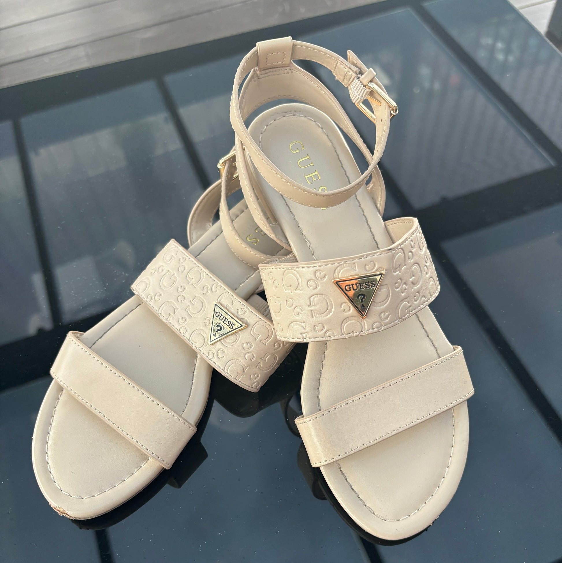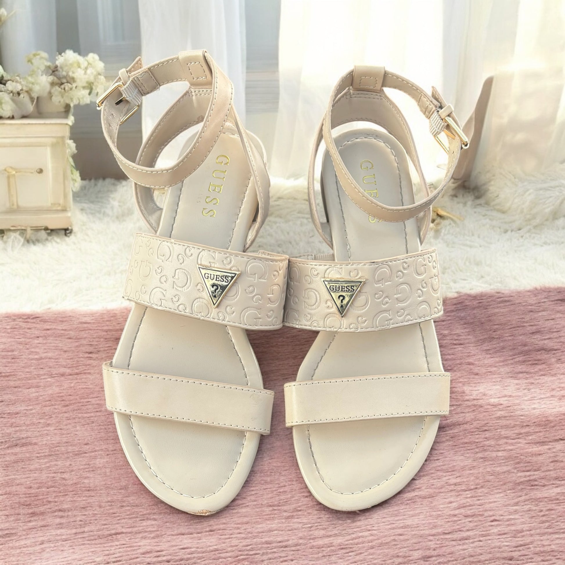 Sandalias Guess beige con placa dorada