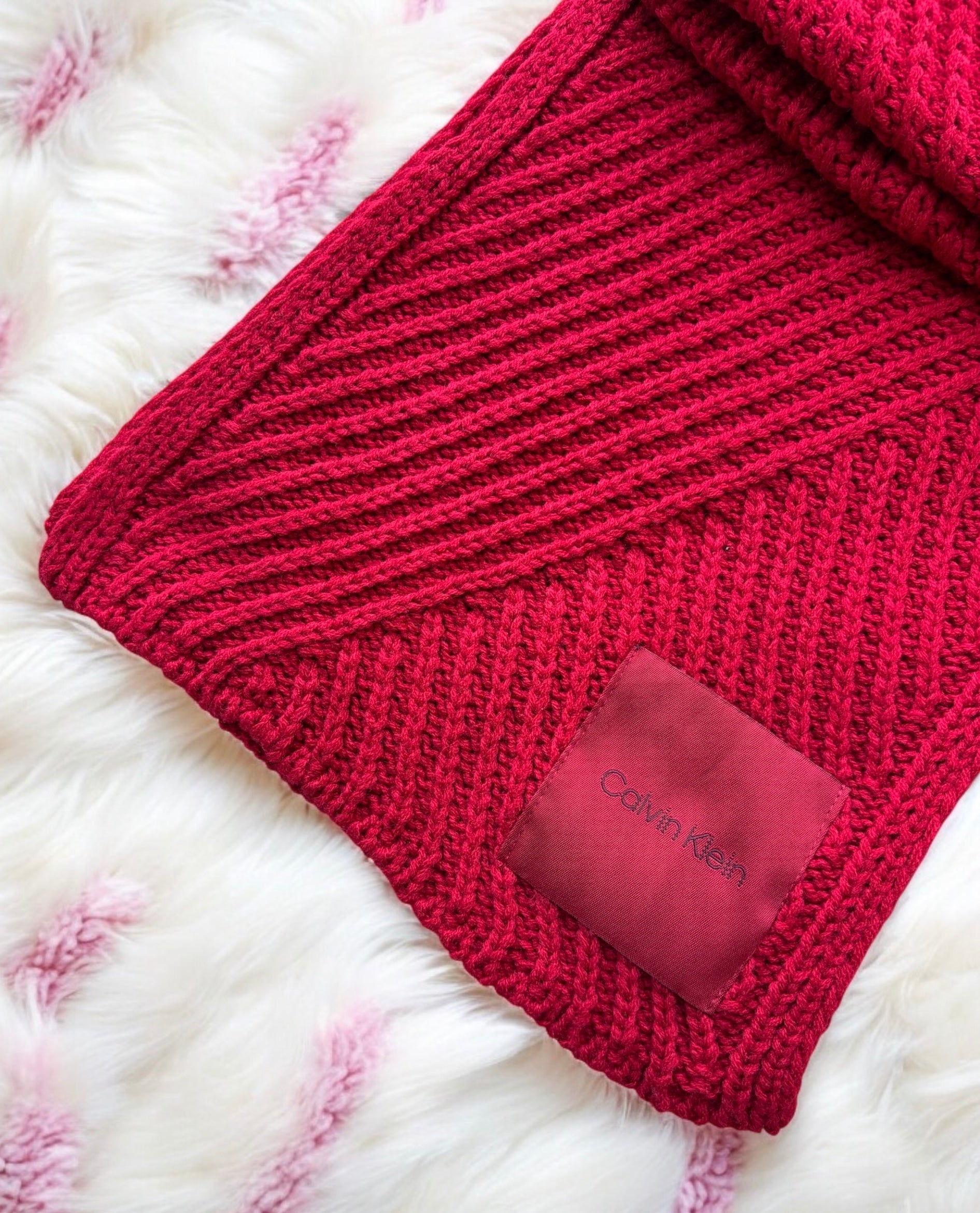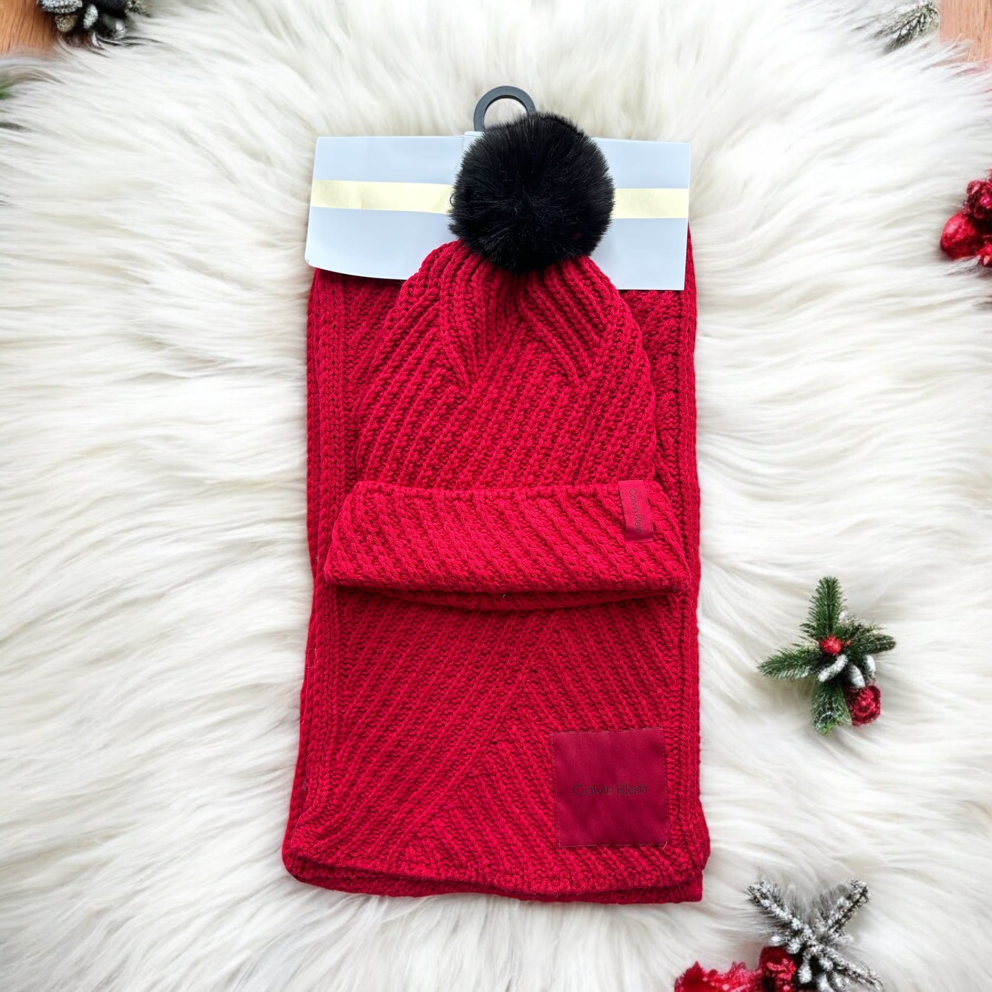 Set Gorro y bufanda de la marca Calvin Klein en color rojo de punto con pompón negro ideal para invierno