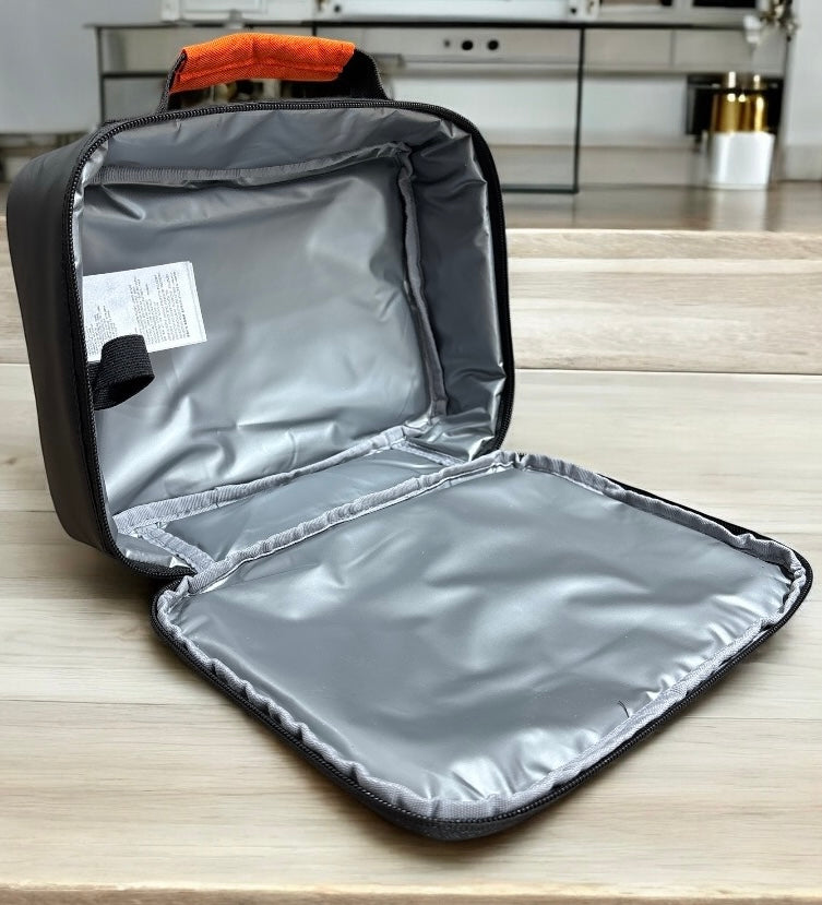 Lunch Bag Nike negra, letras blancas, detalles en naranja