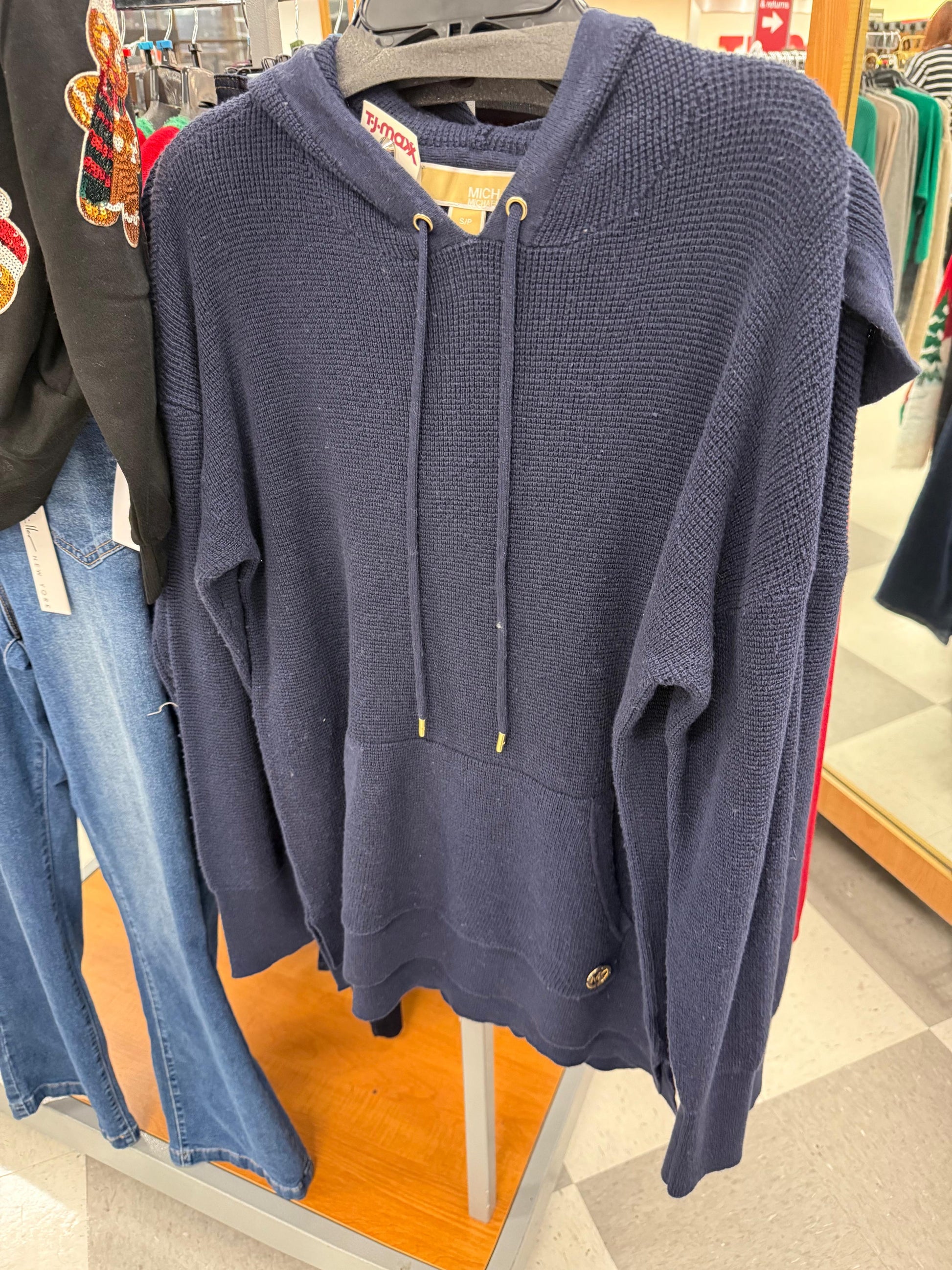 Este suéter de Michael Kors es perfecto para mantenerte cómodo y abrigado en los días fríos. Con su capucha y su placa dorada distintiva, este suéter de color azul marino es una combinación de estilo y comodidad. Hecho con materiales de alta calidad, este suéter te mantendrá abrigado mientras te ves elegante y sofisticado.