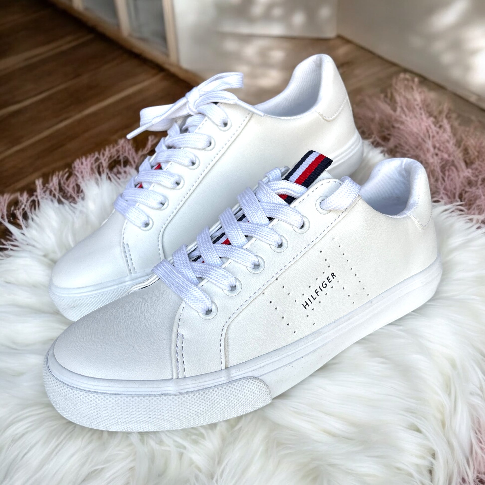 Tenis Tommy H blancos con letras pequeñas azul marino