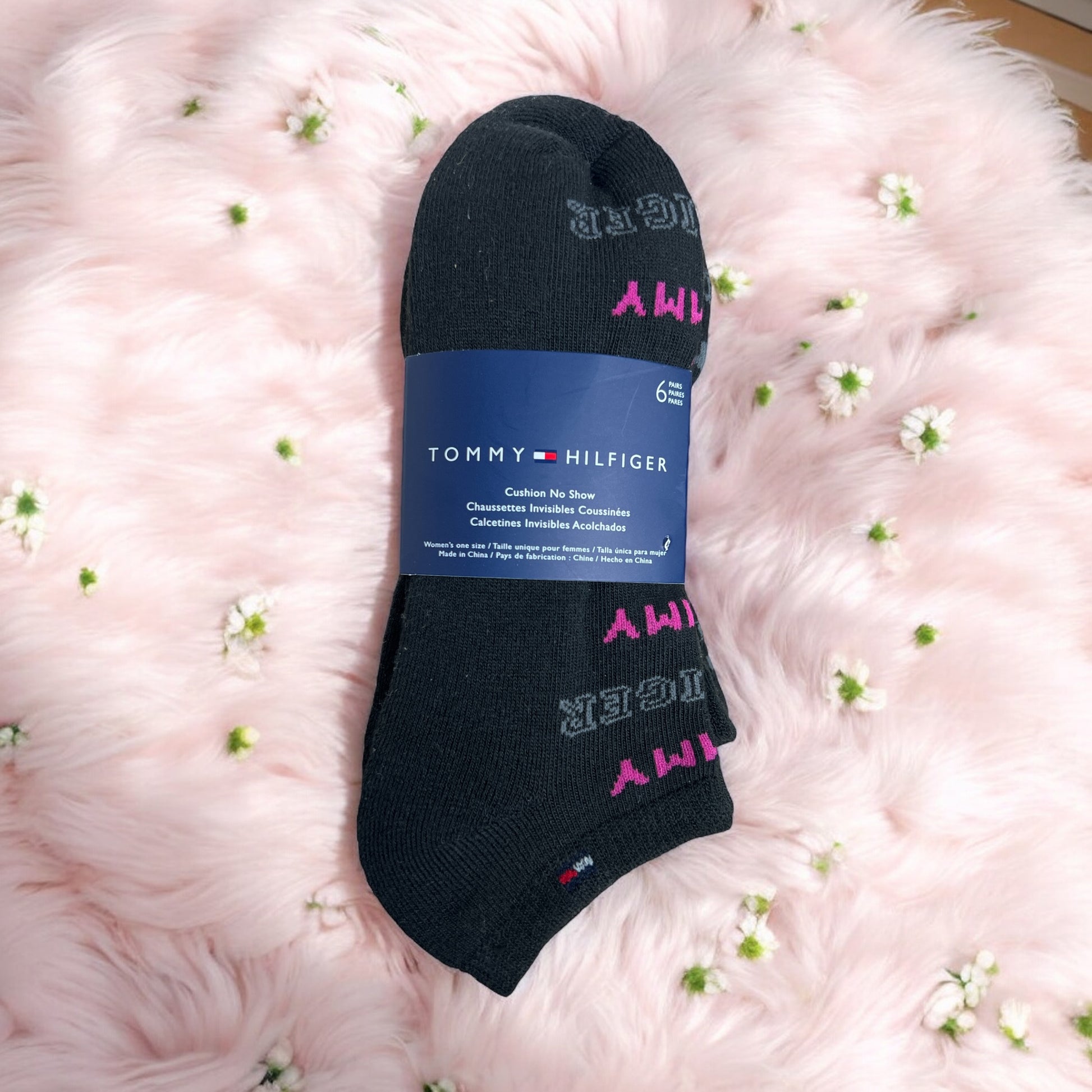 Tines Tommy H negros con letras rosas y gris 6 pares