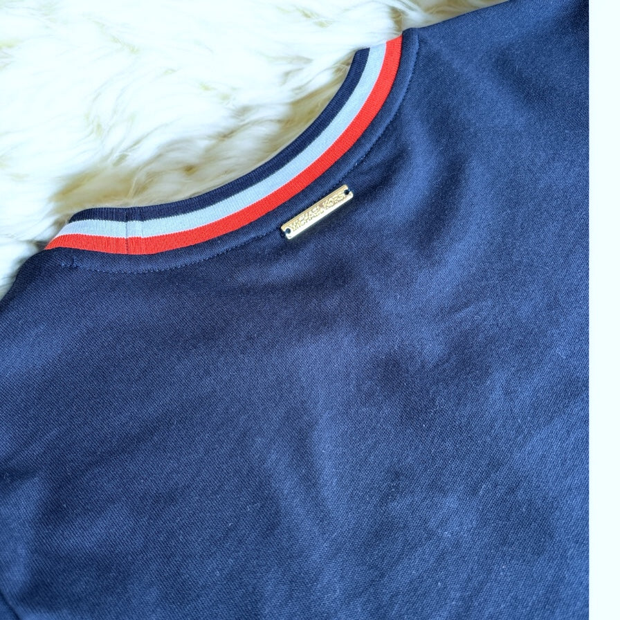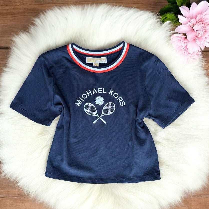Este top Michael Kors azul marino con cuello blanco y acentos naranjas es una elección hermosa para cualquier ocasión. La placa dorada y las letras y raquetas blancas añaden un toque de elegancia. Confeccionado por una marca reconocida, es una prenda de calidad que te hará destacar.