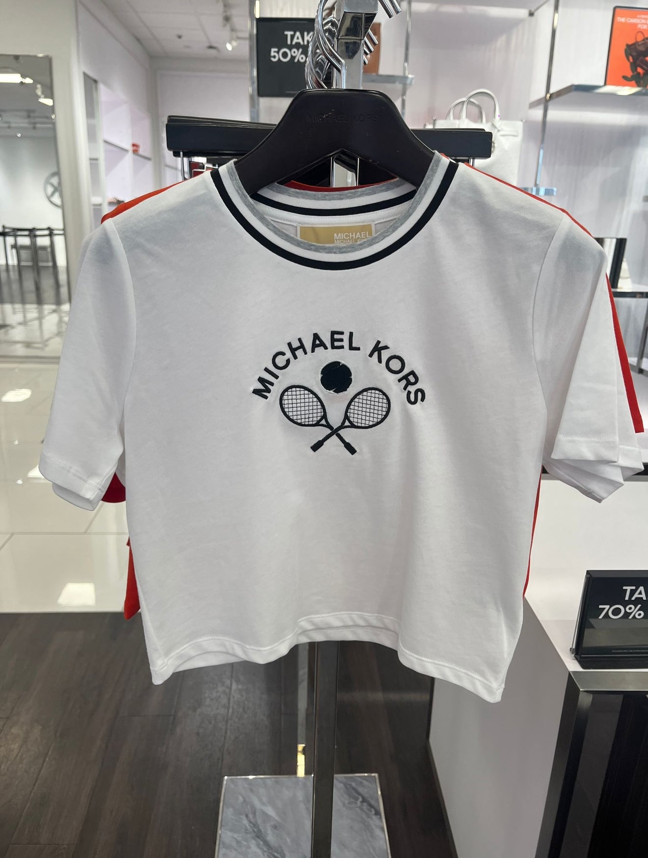 Top Michael k blanco, letras y raquetas bordadas, placa en cuello