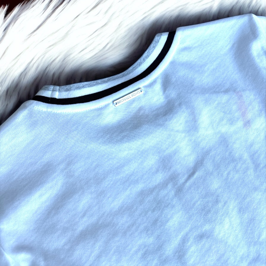 El Top Michael Kors hermoso presenta detalles bordados en letras y raquetas, con una placa elegante en el cuello. Confeccionado con la marca de lujo Michael Kors, este top es sofisticado y elegante, perfecto para cualquier ocasión. Añade un toque de clase a tu guardarropa con este hermoso top.