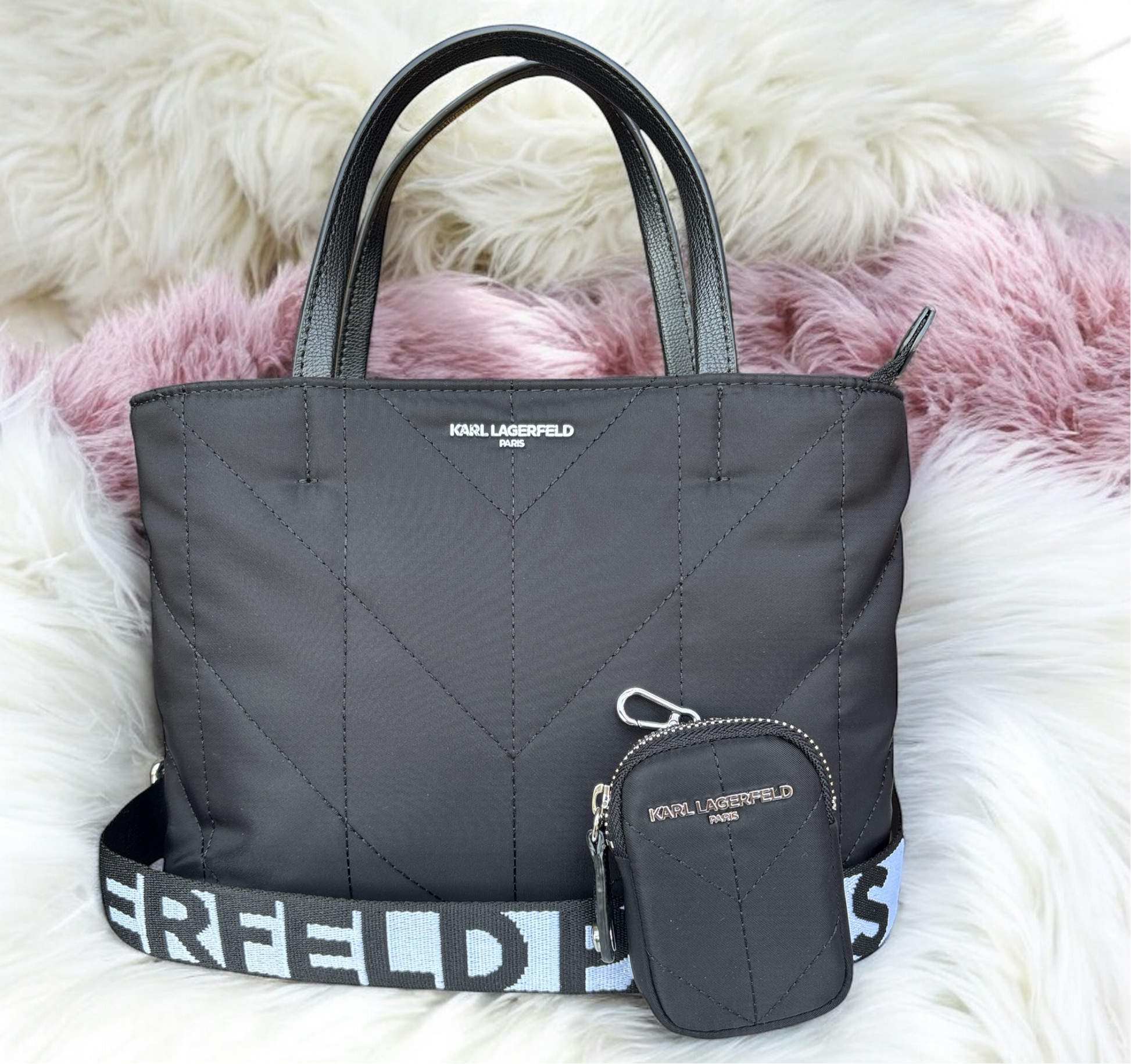 Esta Tote Karl L negra con monedero capitonada es una opción moderna y elegante con su diseño acolchado. Confeccionada por Karl Lagerfeld, experto en la industria de la moda, esta tote ofrece estilo y comodidad al mismo tiempo. Perfecta para llevar todas tus necesidades del día a día con su amplia capacidad.